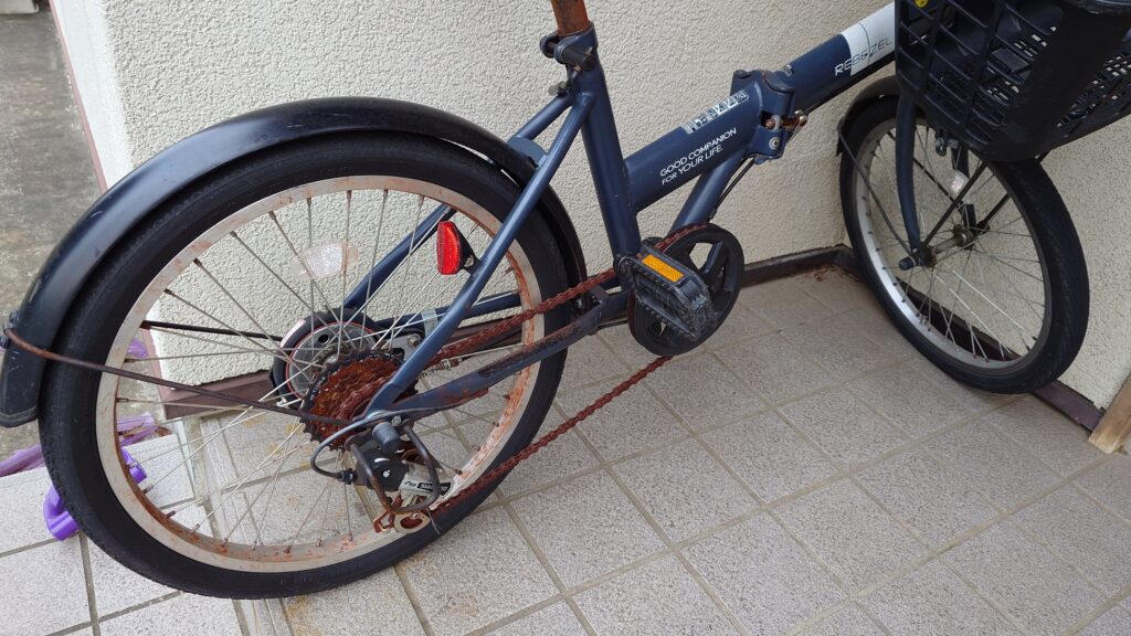 いや~ひどいっすね~。。。外装ギアの金属チェーンの場合、軒先でもこんなです。倉庫やもっとしっかりした駐輪スペースがあればいいんですが、子供の出し入れとか考えると玄関先の屋根下、でこんな感じです。外装とチェーン嫌いはここから。。。あと、この自転車はなんかグニャグニャするんです。