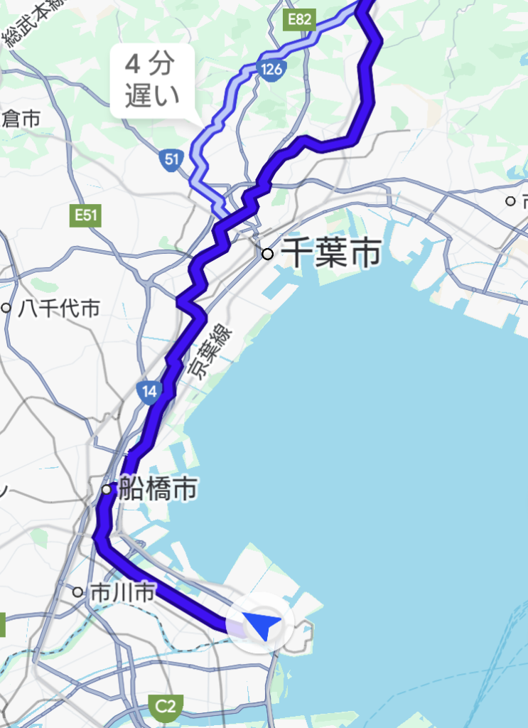 ということで初回は東京都江東区~千葉県千葉市緑区へのGoogleマップだと70km弱と言ったところを100%から走ってみました。比較的平坦基調です。
